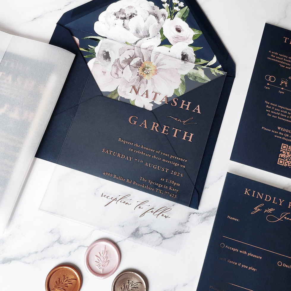 The Acrylic Navy Rose Gold Wedding Invitation by Feel Good Invites is a luxurious and modern invite printed on clear perspex acrylic, featuring elegant rose gold foil text. Coordinating navy backing cards and envelopes, along with a floral envelope liner, create a sophisticated and stylish stationery suite.