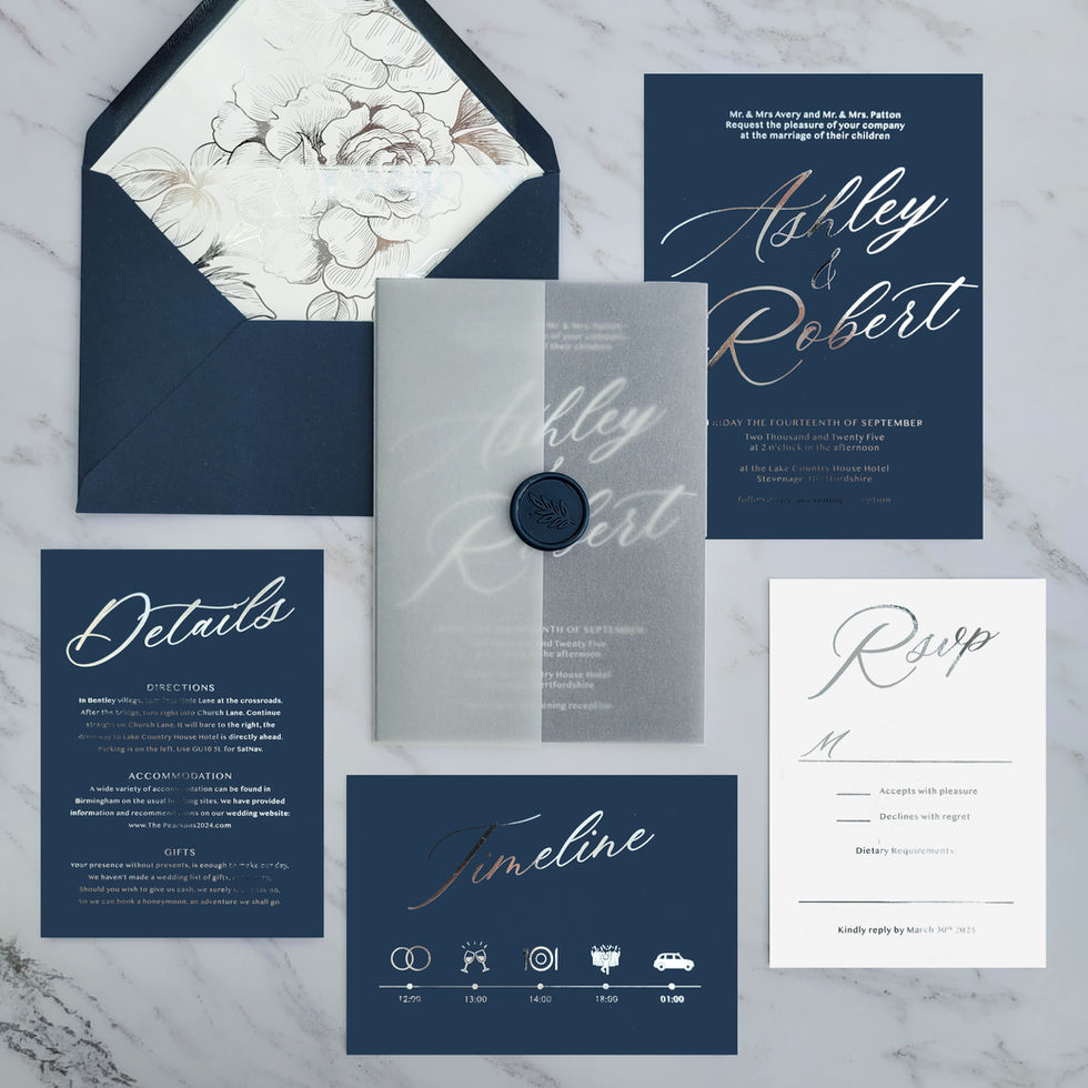 Discover the elegance of the Ashley Navy and Silver Foil Wedding Invitation at Feel Good Invites. Each invitation is crafted on a Soft Touch Card and is available in Gold, Silver, or Rose Gold foil to perfectly match your Imperial Blue wedding theme. Our professional services ensure your wedding invitations exude sophistication and charm, reflecting the importance of your special day. Choose Feel Good Invites for unmatched quality and a seamless, personalised experience.