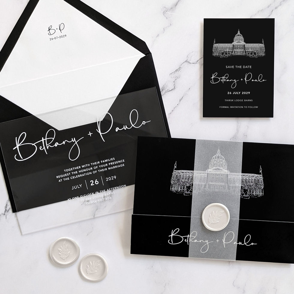 Experience elegance with the Bethany Acrylic Black and White invite from Feel Good Invites. This exquisite luxury acrylic invite with white text comes beautifully nestled in a soft touch card wrap featuring a custom venue sketch, making it an intimate reflection of your special day. The sophisticated design is complemented by a vellum bellyband enclosure, adding a touch of modern charm. Ideal for those who seek both luxury and personalised details, this invite encapsulates everything Feel Good Invites stands for in quality and style. Enhance your event with an invitation that truly leaves a lasting impression.