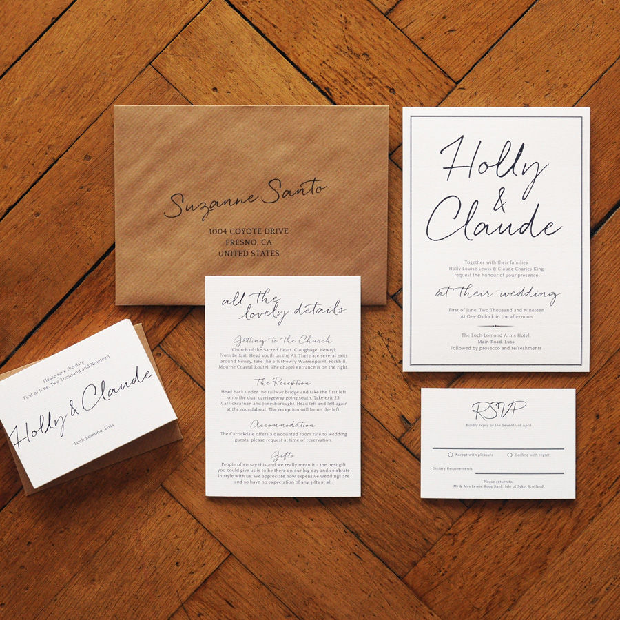 Envelope and text colours can be customised to perfectly suit your wedding theme. Ideal for minimalist weddings, modern weddings, timeless and classic weddings, and couples who love clean, stylish, and elegant wedding stationery.