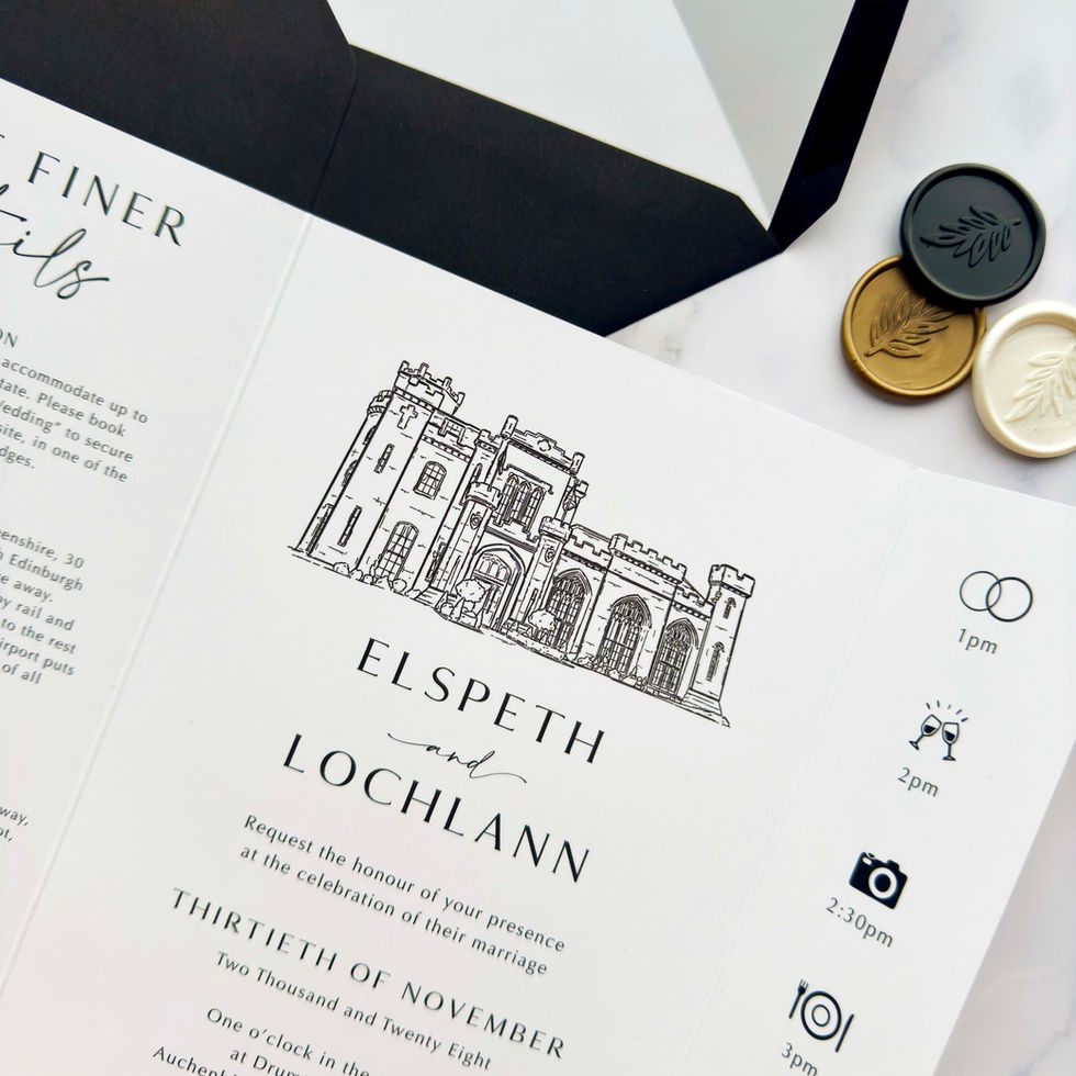 The Elspeth Gatefold Wedding Invitation by Feel Good Invites is a refined, neutral gatefold invite designed for timeless weddings. This elegant wedding invitation features a custom venue sketch, making it a beautiful choice for personalised and bespoke wedding stationery.