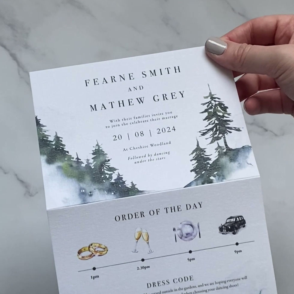 Featuring captivating misty forest scenes and a personalised timeline, these invitations are perfect for creating a timeless mountain or wilderness-themed wedding. Each invitation can include a map and a tear-off RSVP postcard and/or a convenient QR card Elevate your wedding with our elegant and bespoke designs that exude sophistication and natural beauty.