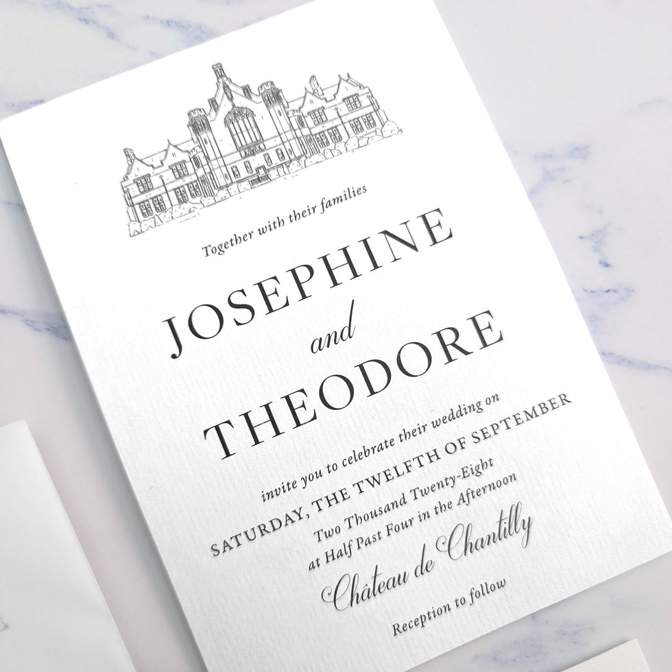 The Josephine Wedding Invitation by Feel Good Invites is a chic and modern wedding invitation printed on crisp white card. Featuring a custom venue sketch, this personalised wedding invitation combines elegance with a bespoke touch.