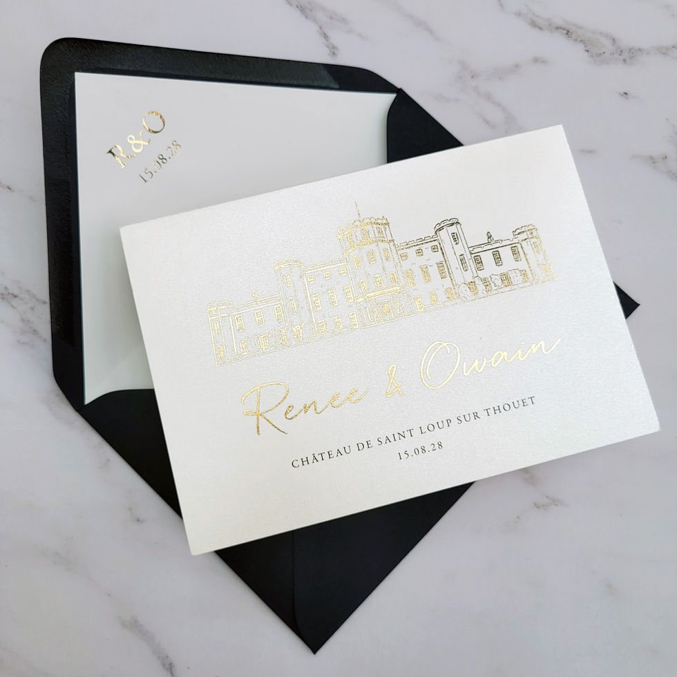 Experience timeless elegance with our Renee Venue Foil, a luxury foil wedding invitation featuring a custom foiled venue sketch/illustration. Printed on luxury pearlised card with a beautiful shimmer, it exudes sophistication and charm. Each invitation can include a map and a tear-off RSVP postcard and/or a convenient QR card. Designed to perfection, this invitation seamlessly combines opulence with functionality, ensuring your special day leaves a lasting impression.