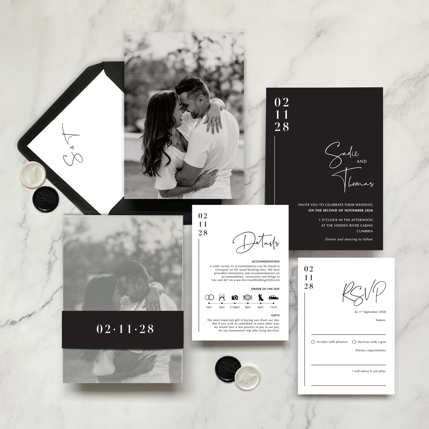 Introducing Sadie; a wedding invitation that embodies modern elegance with custom couple black & white photo, perfect for minimalist couples. Crafted with meticulous attention to detail, this monochrome design includes essential elements for your engagement, from RSVP cards to detailed inserts. The vellum wrap and belly band add a touch of sophistication, ensuring your special day stands out. At Feel Good Invites, we take pride in creating beautiful, timeless invitations that capture your love story. Discover Sadie and start your journey to "I do" with style and grace.