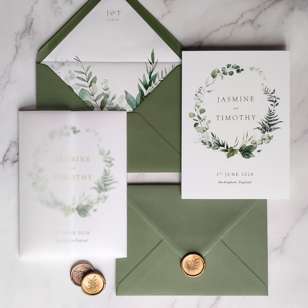It comes with a coordinating vellum wrap for a soft, sophisticated finish, and both the envelope and text colours can be customised to perfectly match your wedding palette. Ideal for woodland wedding invitations, nature-inspired wedding stationery, personalised wedding invites, and luxury folding wedding invitations with a refined, botanical touch.